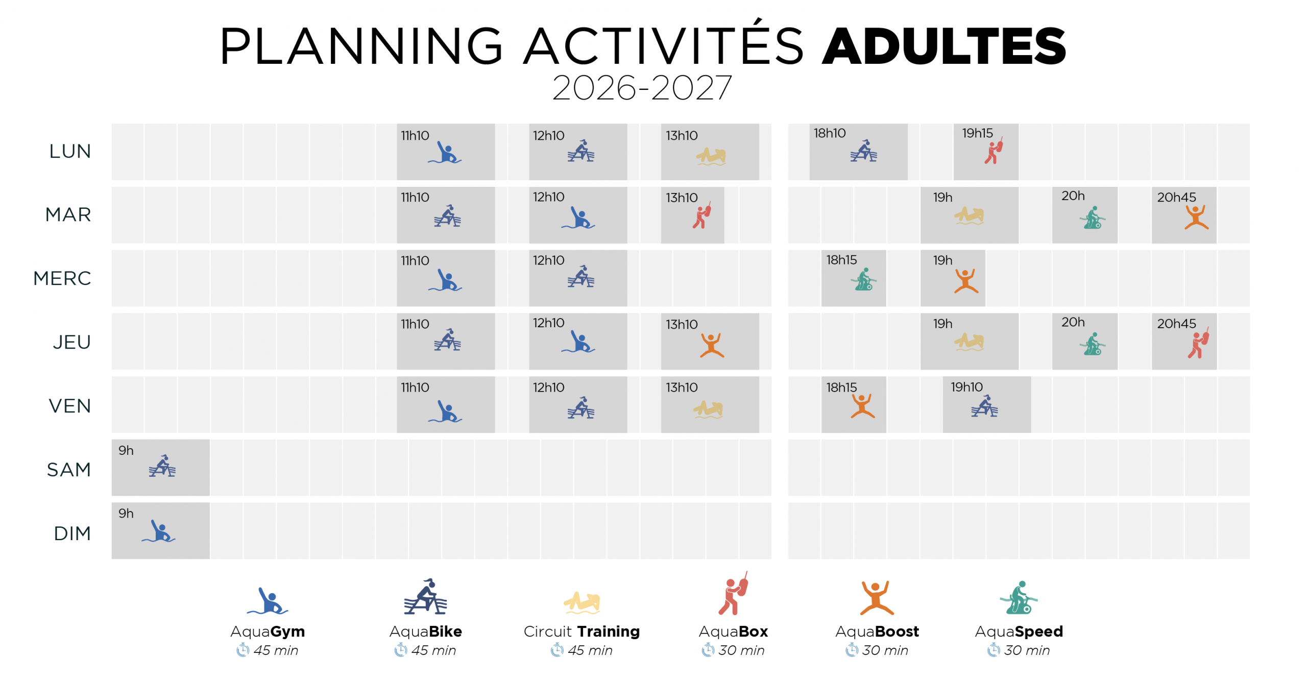 PLANNING ACTIVITÉS AQUATIQUES ACTIVITÉS ADULTES AQUAGYM AQUASPEED AQUABOXE AQUABIKE AQUA BOOST CIRCUIT TRAINING ACTIVITÉS ENFANTS BB & Cie CIRCUIT KIDS AQUASAFE ACADÉMIE DES KIDS CAP BLEU CAP ROUGE CAP BLANC
